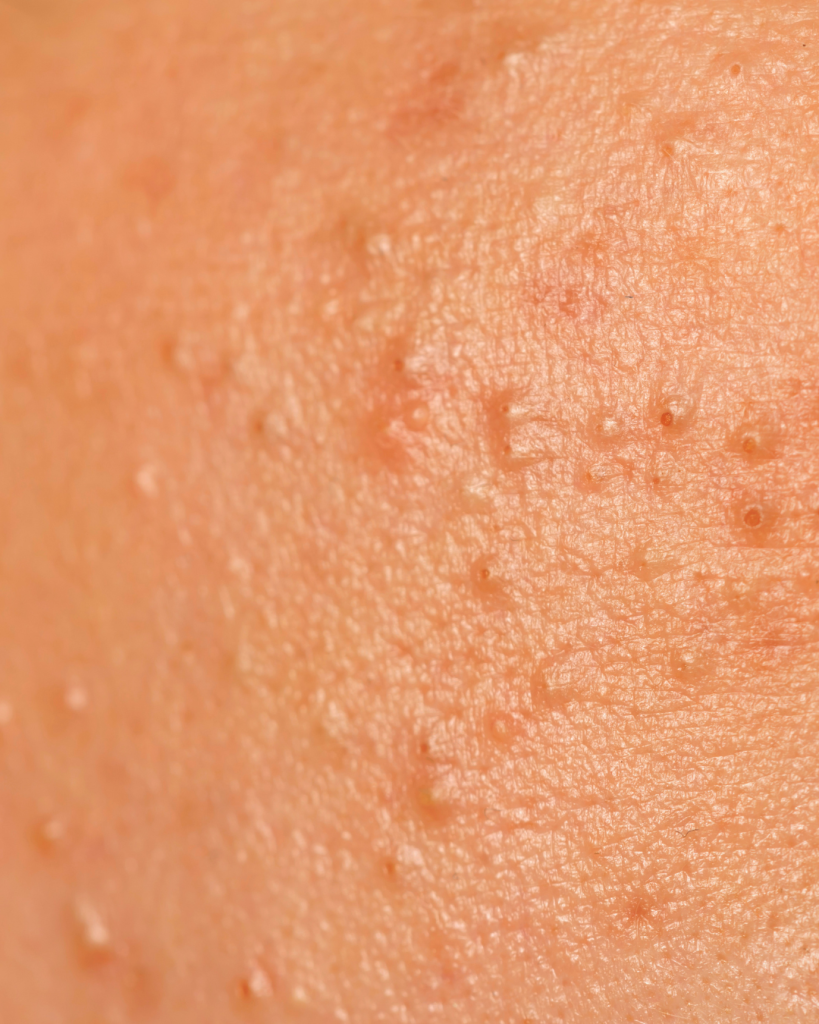 - Uniform bumps – small, same-sized breakouts rather than mixed blackheads, cysts, or whiteheads.